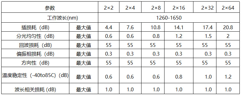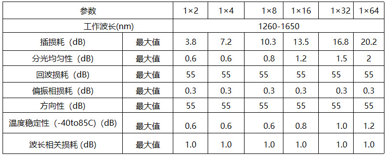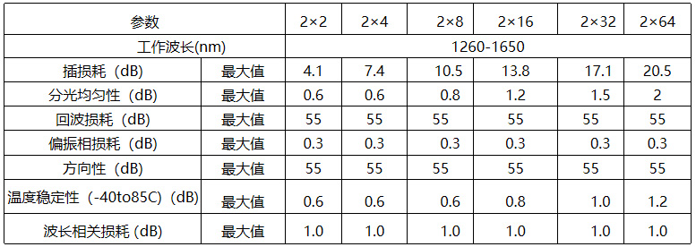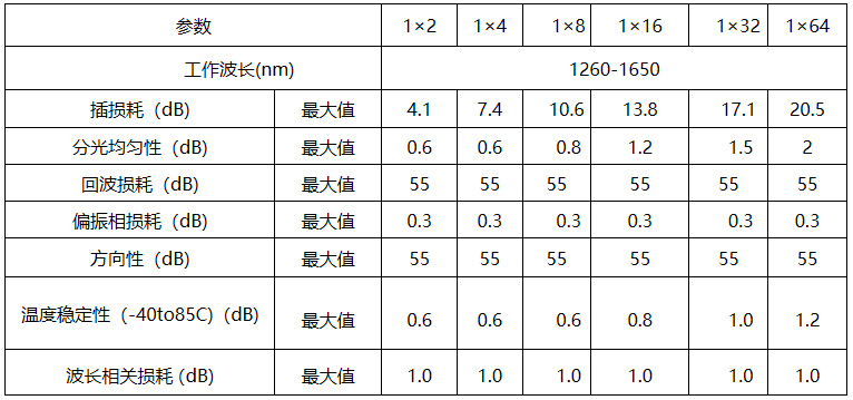 1:N(N≥2)PLC 光分路器(無連接器)光學(xué)特性