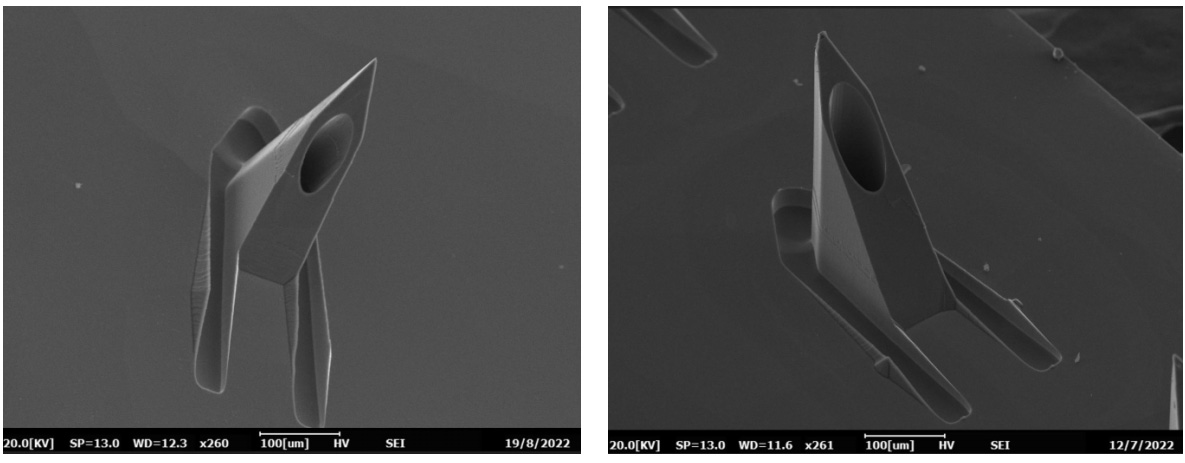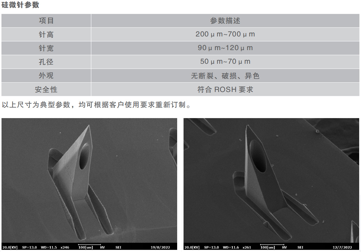 本產(chǎn)品空心硅微針,為中空結(jié)構(gòu),內(nèi)含有可傳輸液體的孔道,采用單晶硅材質(zhì)制造,可用于醫(yī)療美容領(lǐng)域,微針高度為 200~700 微米范圍。